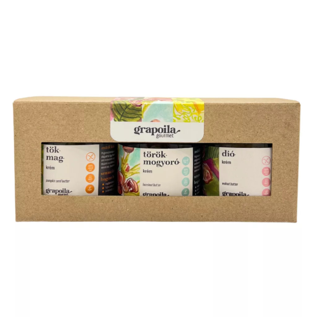A Grapoila natúr magkrémei sokoldalúan felhasználhatóak, jellegükből adódóan ínycsiklandó desszertek, krémek, süteménytöltelékek, vagy mártások, szószok, szendvicskrémek, dip-ek készülhetnek belőlük. Smoothie-ba, zabkásába is kiválóak. 100%-ban természetes, natúr magkrémek, azaz még cukrot sem tartalmaznak, így felhasználáskor döntheted el, hogy sós vagy édes irányba viszed el az ízüket. A tökmag-, dió- és törökmogyoró-krémet tartalmazó csomag zero waste technológiával készül, azaz az olajsajtolás finom és tápláló melléktermékei közül kóstolhatsz meg hármat ebben a karácsonyi csomagban.