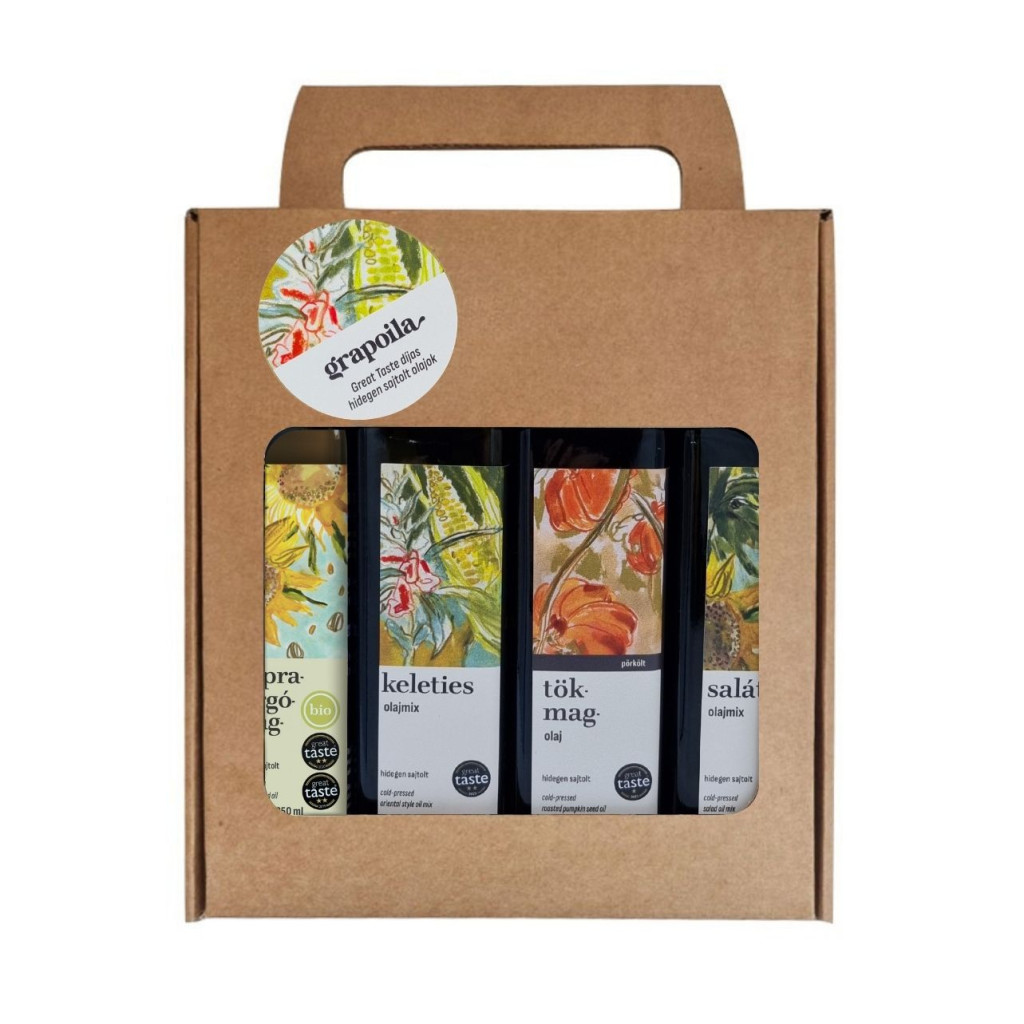 Tartalma 4x250 ml: BIO napraforgóolaj, Keleties olajmix, Pörkölt tokmagolaj, Salátaolaj mix Bio Napraforgóolaj: Sárga színű, pirított napraforgóra emlékeztető illatú olaj. Hazánk egyik legismertebb és legtöbbet használt olaja, hidegen sajtolt változatban. Sütéshez és főzéshez kiválóan használható közepes hőfokon, azonban ne hevítsük túlzottan hosszú ideig. Hagyományos magyaros ételekhez, saláták, hidegtálak, majonéz készítéséhez ideális. Keleties olajmix: Kiemelt partnerünk, a salátáiról híres Eisberg azzal a kéréssel fordult hozzánk, hogy fejlesszünk egy, a „Csicseri Salátatál” ízeit kiteljesíteni hivatott olajöntetet. A megalkotott keleties ízvilágú olajmixben az ízharmónia olyan jól sikerült, hogy azt az Eisberg salátatálat fogyasztókon túl a Great Taste szakértő zsűritagjai is két csillaggal jutalmazták! A szezám- és kukoricaolaj aranysárga keverékét nemes egyszerűséggel „isteninek” találták, és a kellemes ízvilágú, édes, sós, zsenge, „zöld” beütésű olajat szívesen látnák viszont saját konyhájukban. Az olajkeverék sajátossága, hogy nem csak saláták ízesítésére szolgálhat, de komponenseinek „hőtűrő-képessége” miatt sütéshez is kiváló, így különleges ízt kölcsönözhet a keleti konyha ételeinek, wokban sült finomságoknak. Pörkölt tökmagolaj: A Grapoila legújabb tökmagolaj-változata pörkölt magokból. A gyártási eljárás változatlanul a hidegen sajtolás, de a magokat előzetesen finoman pörköljük. Ezzel a hőkezeléssel bár veszítünk némileg a hőérzékeny vitaminokból és tápanyagokból, de az erre kifinomultak nyernek a kulináris élvezeteken. A pörkölt magokból sajtolt olaj más, különleges ízélményben részesíti őket, a pörkölés kiemeli, mélyíti a tökmagolaj ízét, karakteressé teszi azt. Olyannyira jól sikerült ez az olaj, hogy éppen csak felkerült a boltok valódi és virtuális polcaira az angolszász piacon, és rögtön csillagot kapott a Great Taste-en. A zsűri véleménye szerint „csodás illata egyből kóstolásra csábít, az olaj selymesen körbefut a szájban, miközben a pirított aromával vegyülő diós tökmagíz szépen kiteljesedik anélkül, hogy túlontúl intenzívvé válna.” Salátaolaj mix: Ezt az olajkeveréket dietetikus és séf közreműködésével alkottuk meg. Célunk az volt, hogy olyan salátaolaj kerüljön a fogyasztók asztalára, amely ízével növeli a saláták élvezeti értékét, ugyanakkor pedig értékes tápanyagokkal turbózza fel azokat. Hogy mit adhat hozzá egy olajöntet az önmagukban is egészséges és tápláló zöldségekhez, gyümölcsökhöz? A Grapoila Salátaolajat úgy komponáltuk meg, hogy az jelentős mennyiségű - és optimális arányú - Omega-3 és Omega-6 zsírsavval, E-vitaminnal és egyéb antioxidáns tápanyaggal gazdagítsa a salátákat, hidegtálakat, ételeket. Összetevők: hidegen sajtolt kukoricacsíra-olaj, napraforgóolaj, kendermagolaj és lenmagolaj