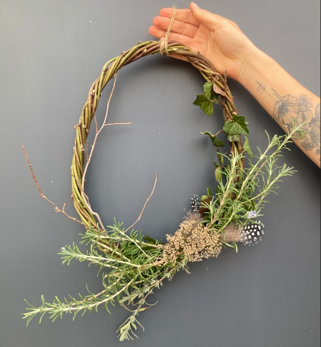 Húsvéti ajtódíszünket a permakultúrás kertünkből származó természetes anyagok, pl. illatos fűszerek felhasználásával készítjük.